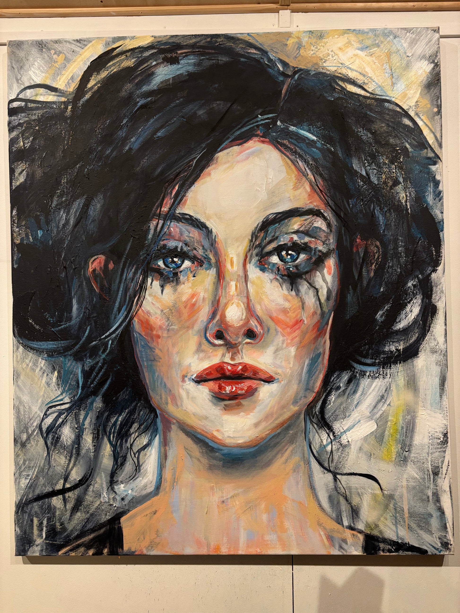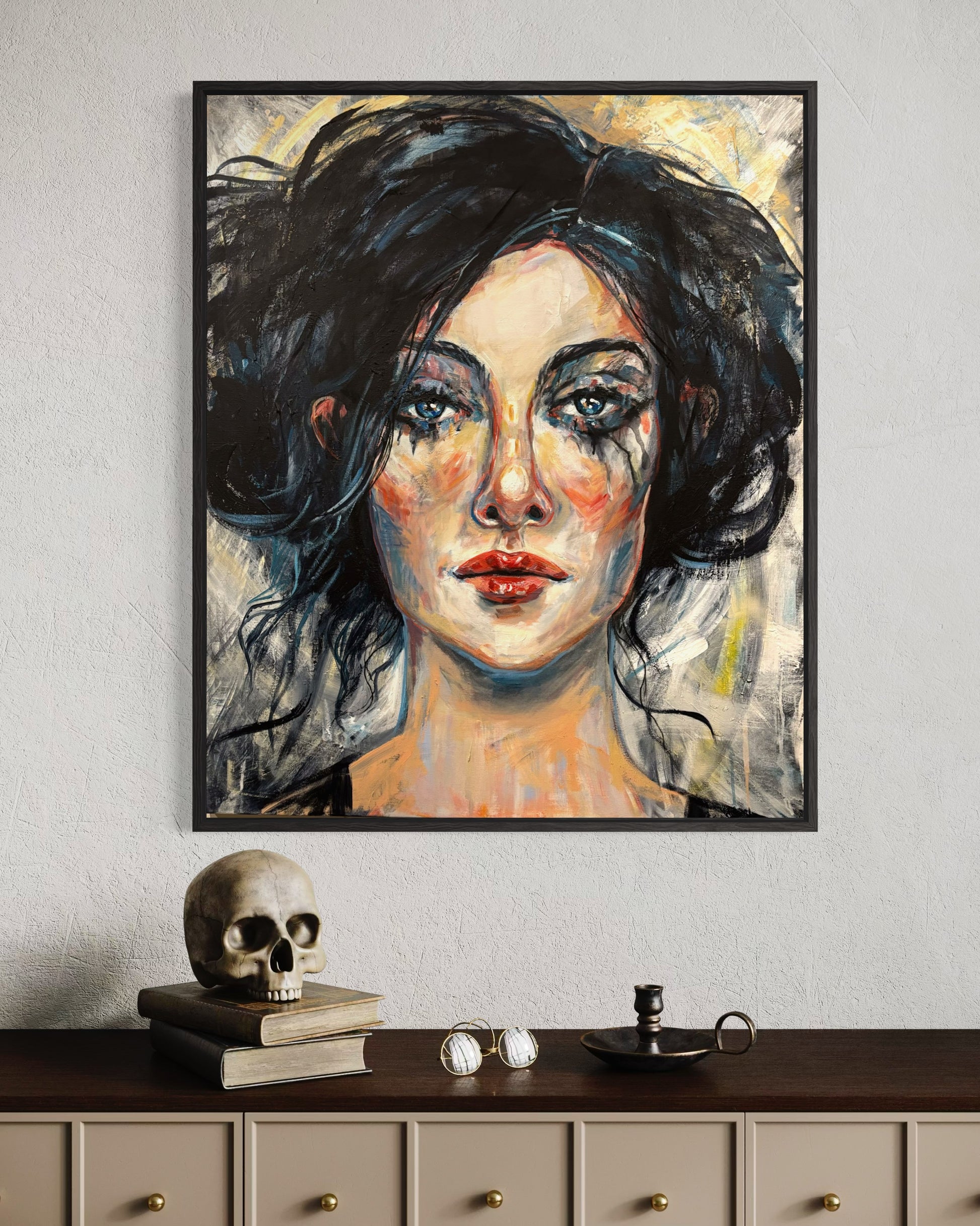 Emotions is a powerful and intimate acrylic painting portraying a woman caught in a moment of raw honesty. With softly blended tones and subtle textures, her expression reveals vulnerability, strength, and everything in between. The slightly running mascara adds depth and storytelling — a reminder of what it means to feel deeply and unapologetically.